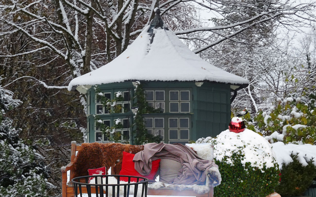 Stühle und Bänke lassen sich mit Kissen und Decken gemütlich ausstatten. Ein weiches Fell sorgt für zusätzliche Wärme. Besonders in der oft wechselhaften Zeit vor Weihnachten lohnt sich ein schützendes Dach. In einem Pavillon, einer Laube oder einem Gartenhaus lassen sich wunderbare Feste feiern – mit Kerzenschein, Holzfeuer, heißem Tee, Punsch oder Glühwein entsteht eine Atmosphäre voller Geborgenheit und winterlicher Abenteuerlust.